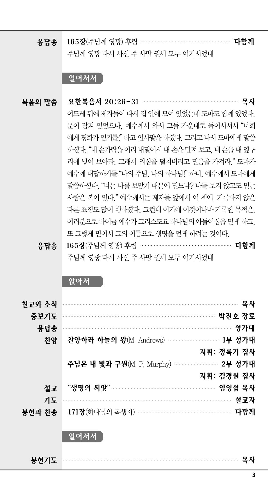 | 성경구절 | 사도행전 2:14a, 22-24 / 베드로전서 1:3-6 / 요한복음서 20:26-31 |